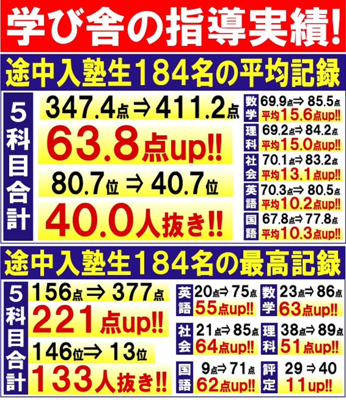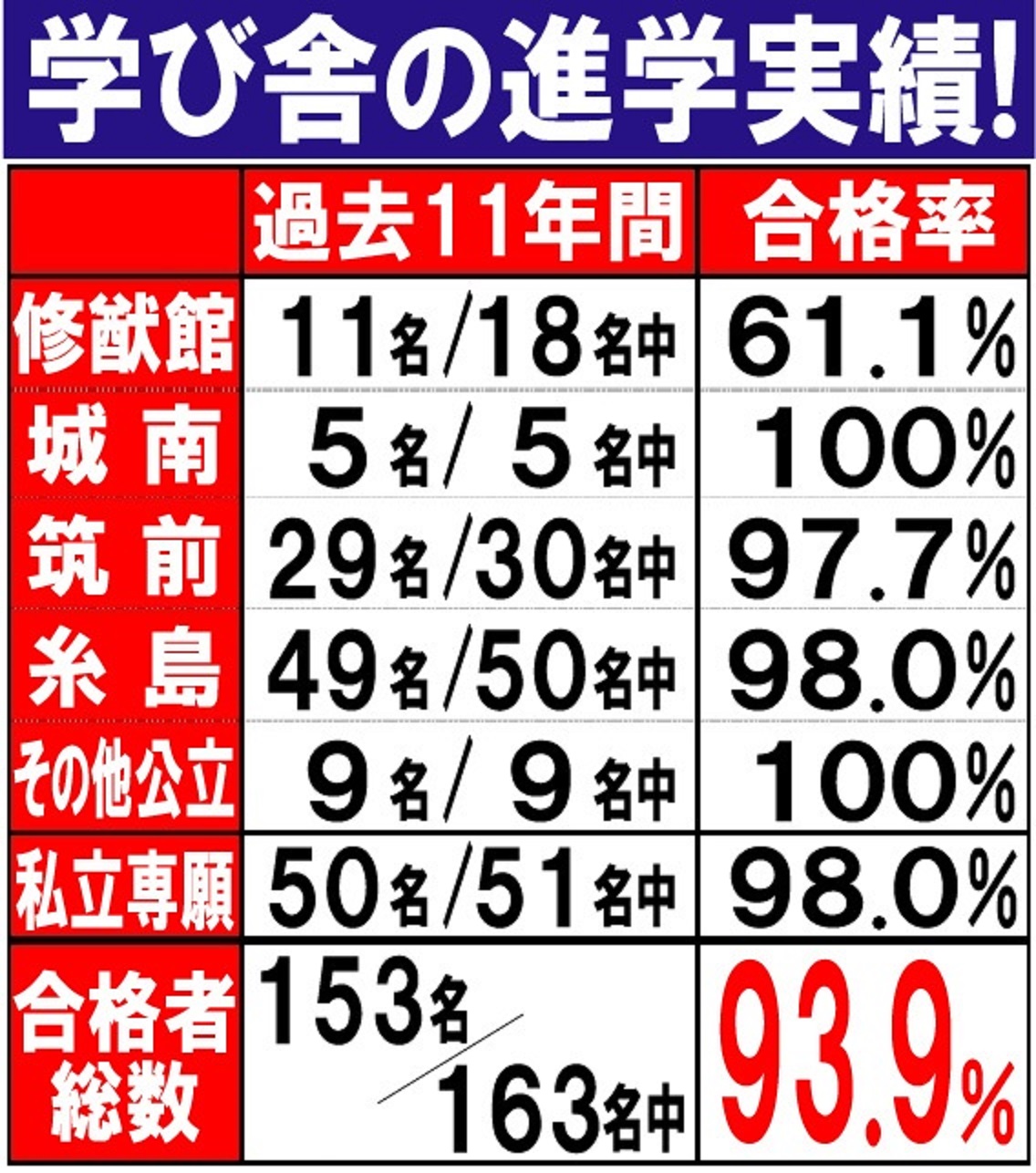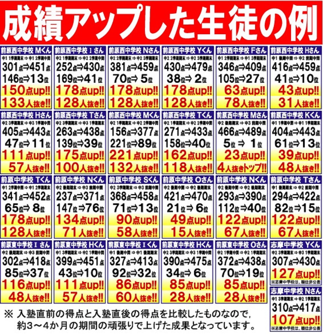 過去11年間の進学実績の詳細と入塾した生徒たちの成績アップの状況です。